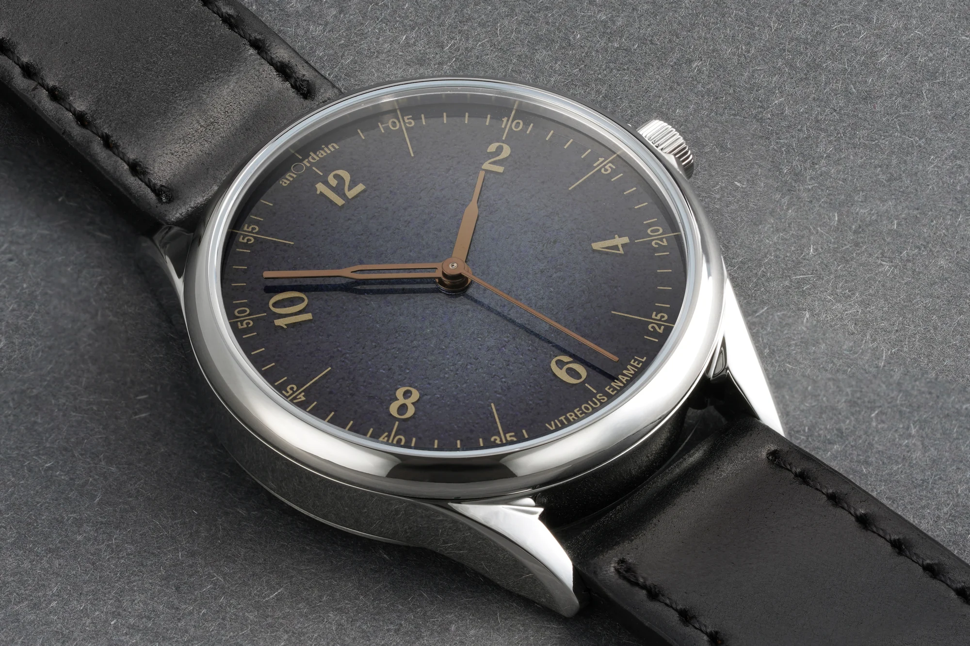 anOrdain is celebrated for its artisanal craftsmanship, and the Model 1 is no exception. Each vitreous enamel dial is handcrafted in Glasgow, taking a minimum of 12 hours to complete. At 10.1mm, it’s not the thinnest on this list, but its uniqueness and artistry make it stand out.