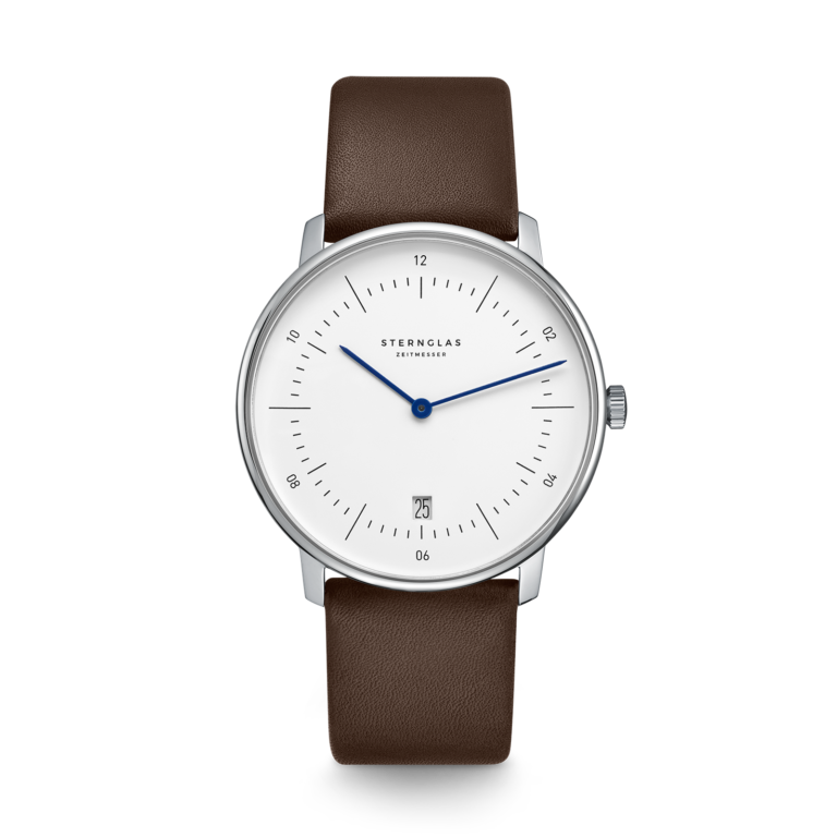 The STERNGLAS Naos offers Bauhaus-inspired design at an accessible price point. This timepiece excels in simplicity, with a clean white dial, polished stainless steel case, and blue hands for a subtle pop of color. With a height of just 6mm, it’s one of the thinnest quartz watches on the market.