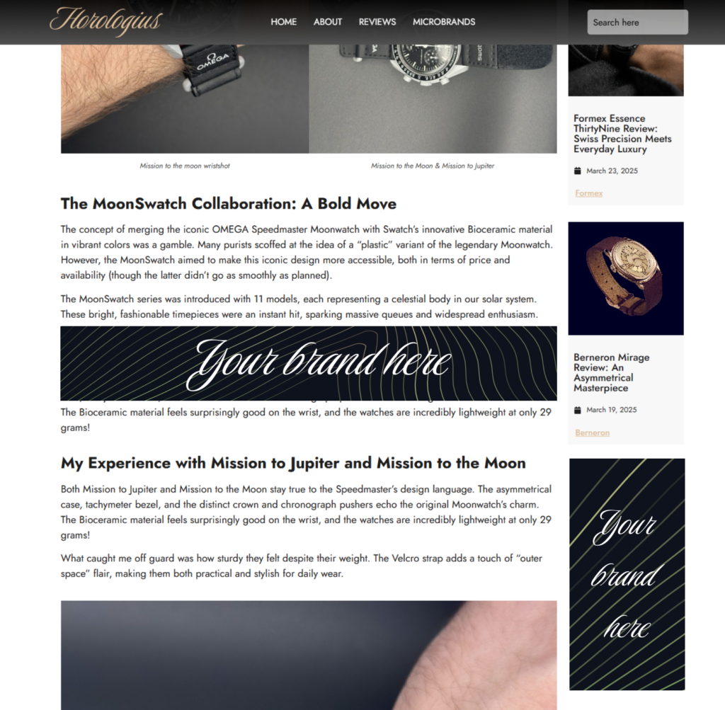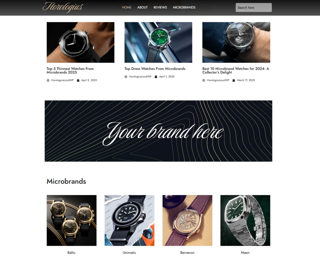 Maximize your brand’s visibility with strategic, high-impact banner placements that seamlessly integrate into the Horologius experience. Whether on the homepage or within our in-depth reviews, your brand will be placed directly in front of an engaged audience of watch enthusiasts.