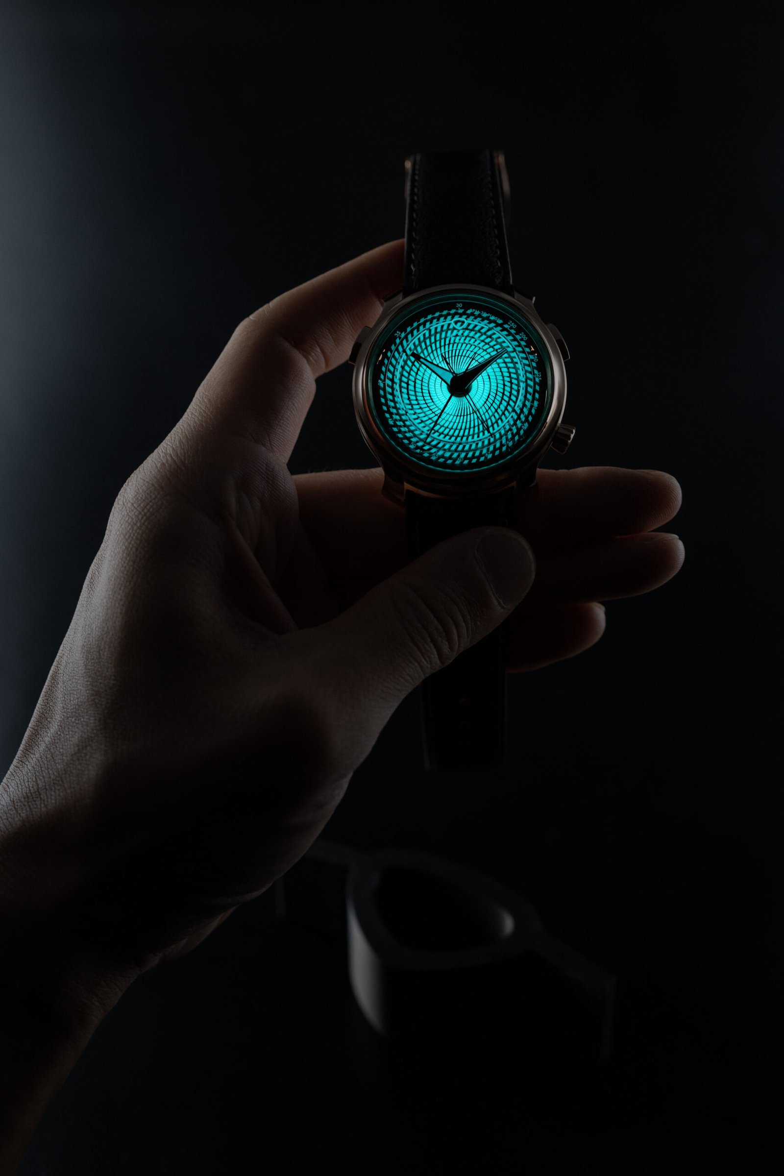 Viewed from an angle, you see the dial undulate like liquid glass over the movement beneath. This is pure artistry meeting physics, and it borders on hypnotic (you’ll catch yourself just watching light play across it instead of the time). The crystal itself carries lume on its underside, illuminating secondary scales and indices when darkness falls.