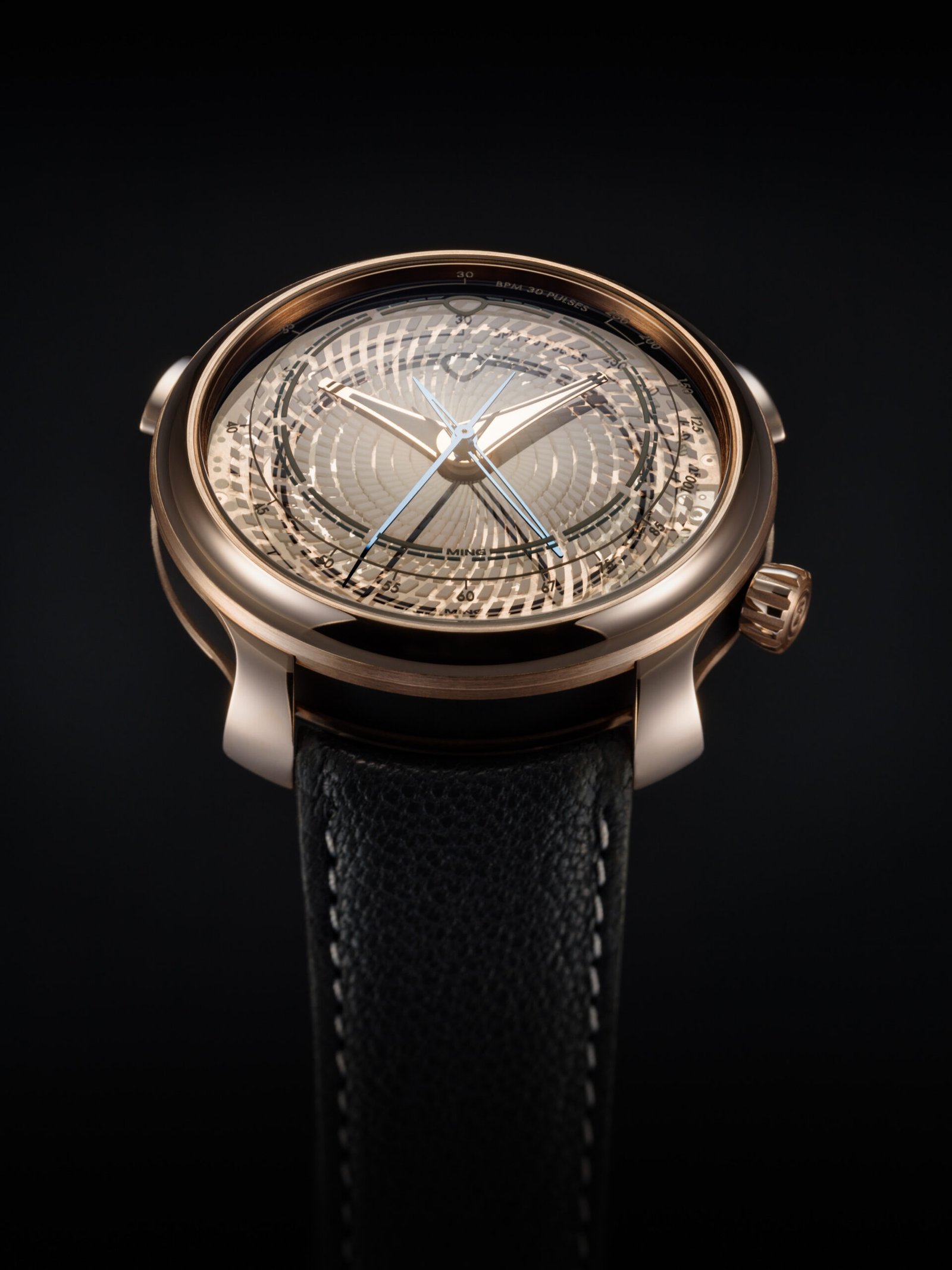 This iteration, created exclusively for MING, is manual-wind and sports 5N rose gold bridges with hand-polished anglage. Every bridge gleams; every screw feels placed with intent. There’s even a hard stop when fully wound, small details like this remind you you’re interacting with something engineered by people obsessed with the tactile experience of watchmaking.