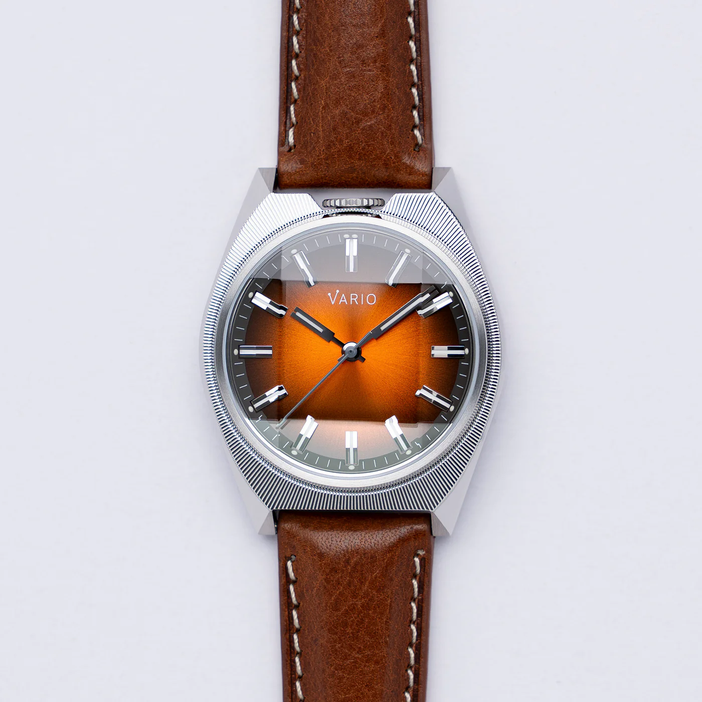 One of the strongest aspects of the Futurist is how well Vario executes the dial variations. The collection comes in sunburst red fume, sunburst green fume, sunburst blue fume, sunburst orange fume, sunburst purple fume, black and silver, and each one brings out a different side of the design. The red is the boldest, the green/orange is arguably the most jewel like (which I obviously love the most), the blue/purple has a cooler sci fi feel, and the silver/black gives the whole watch a more restrained, architectural tone.